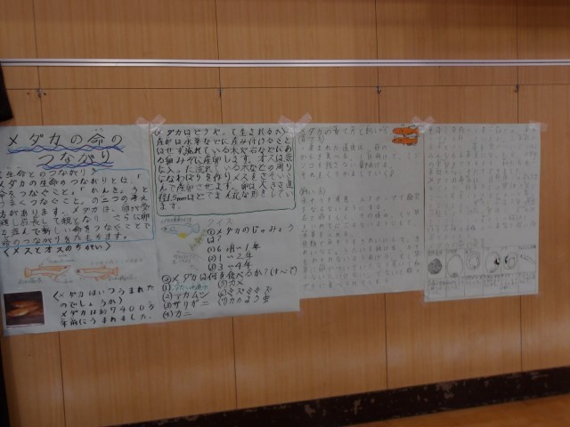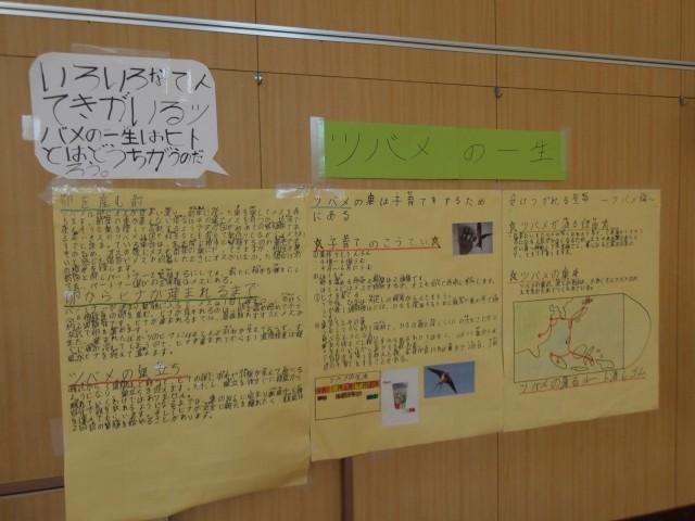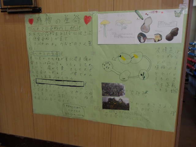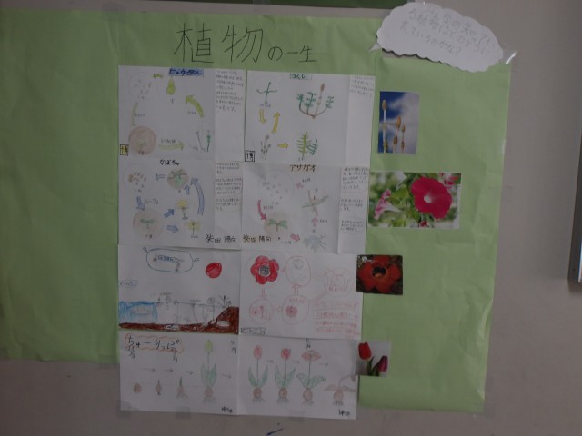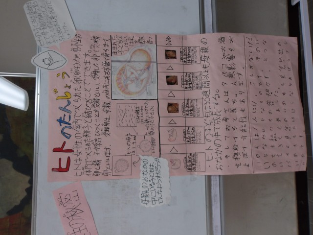 明後日、高学年で実施される、助産師さんの性教育の授業に向けて、5年生が理科の時間に頑張って作ってきた動植物の生命の誕生について各班でまとめたものが講堂に展示されました。