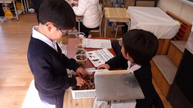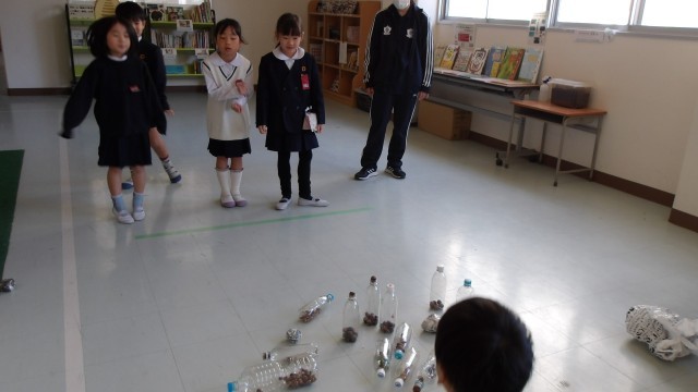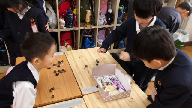 今日は、1年生が、まつぼっくりやどんぐりなど秋の自然のものを使ってつくったおもちゃで、「おもちゃまつり」をしていました。