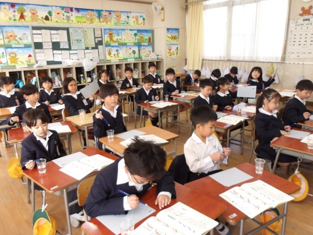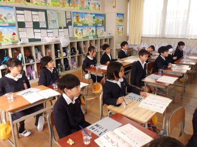 今日は2年生の教室で、水書筆を使った運筆の学習が行われました。