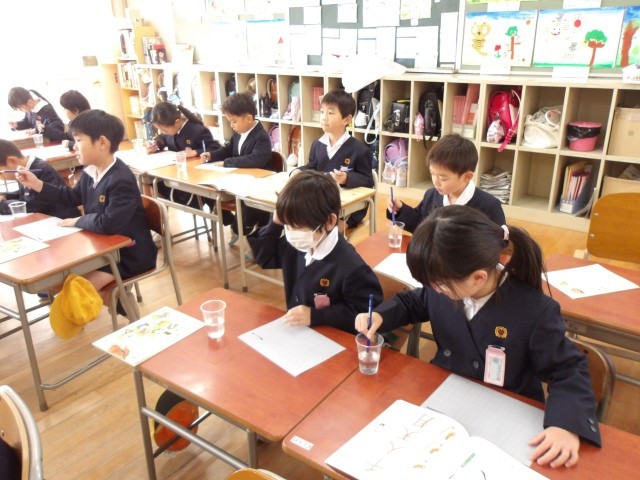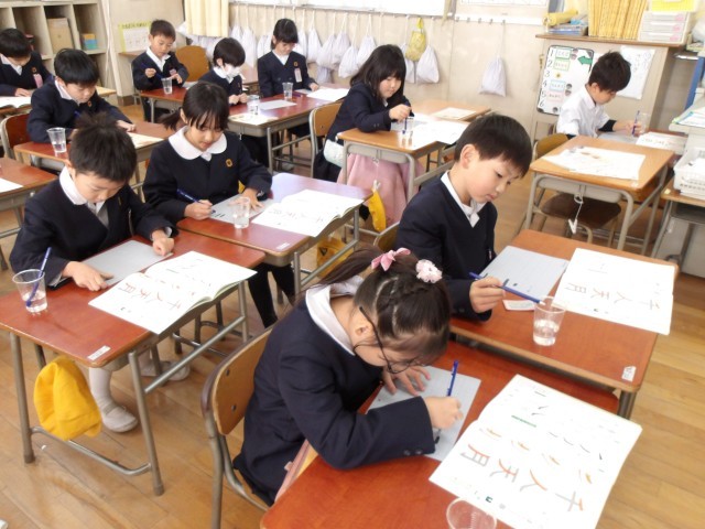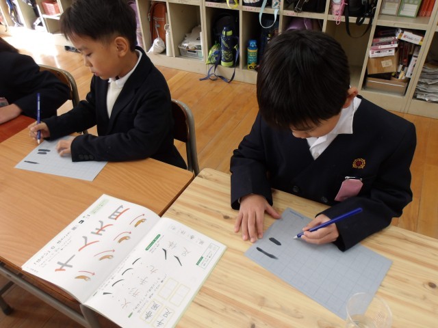 墨汁と毛筆を使ったいわゆる「習字」の学習は3年生から行われますが、2年生では水書筆を使って運筆の学習が行われます。