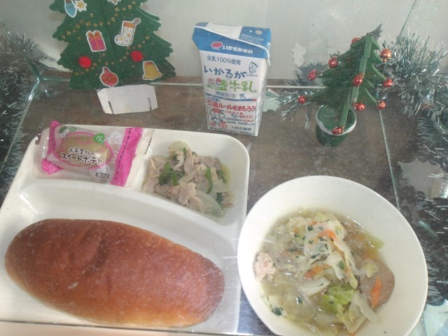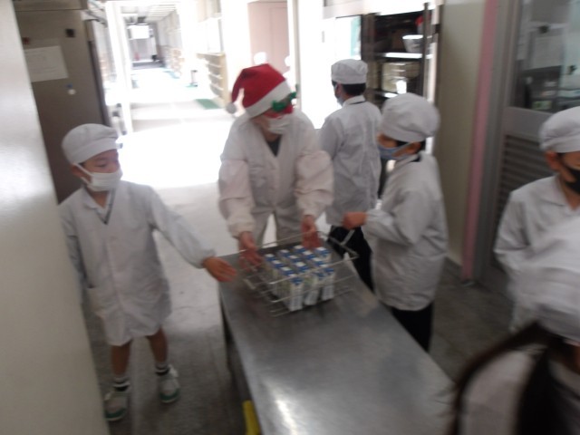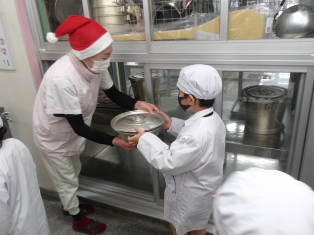 クリスマス間近ということで、給食調理員さんも“クリスマスモード”で子どもたちを出迎えてくださいました!