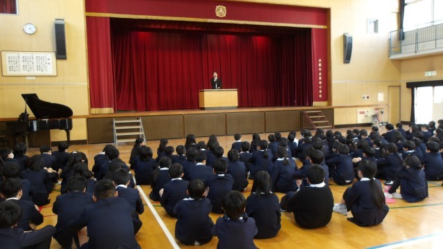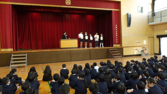 終業式では、校長先生から「各学年の頑張ったことや、よかったところ」のお話があり、子どもたちは真剣な表情で耳を傾けていました。
