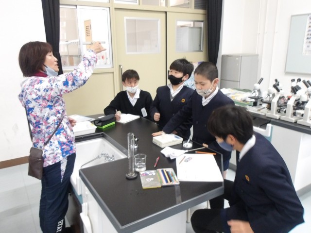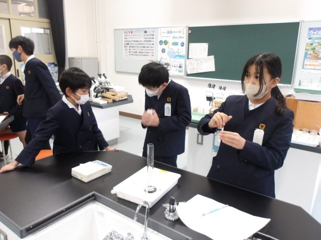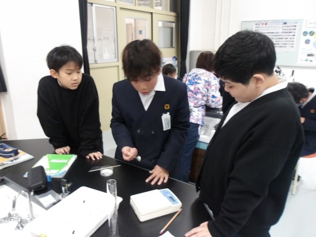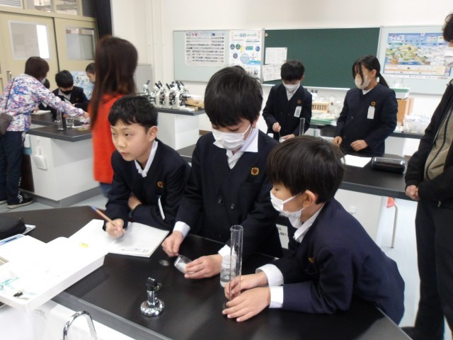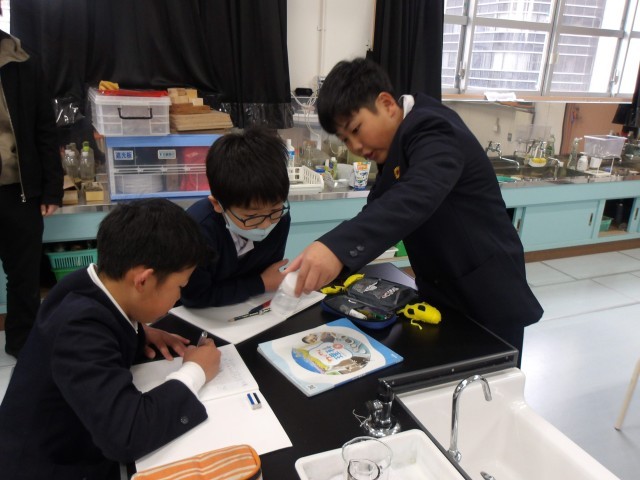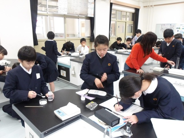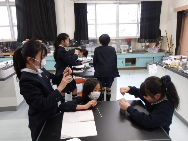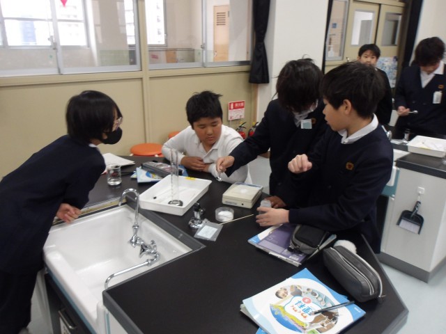 理科の時間に「もののとけ方」の学習をしている5年生。