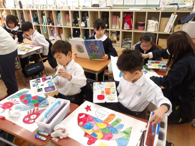 2年生の子どもたちはこの絵本を参考に、自分で考えた“にじいろのさかな”が暮らす海の世界をパスと絵の具で表現していきます。