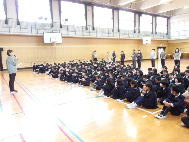 校内での緊急時に備えての訓練を行い、放課後やお休みの日にお外で過ごすときに、子どもに近づいてくる不審な人の見分け方「はちみつじまん」について、校長先生から教えていただきました。