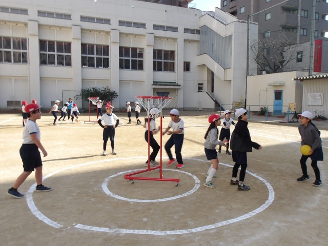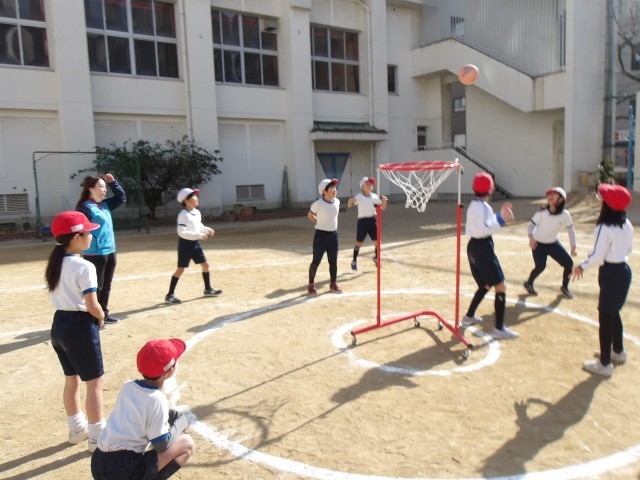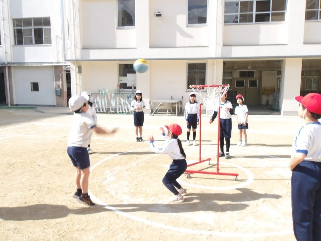 「セストボール」とは、バスケットボールに似たスポーツで、バスケットゴールではなく、360度どこからでもシュートが可能なリング(ボールかご)にボールを入れていくスポーツです。高学年で行うバスケットボールに向けての入門用として行われるスポーツで、子どもたちは夢中でボールを追いかけ、シュートをねらっていました!