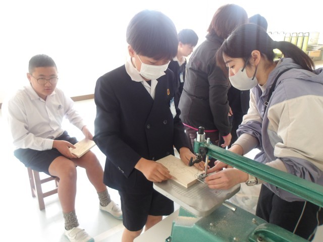 木材への色付けや電動糸のこぎりで裁断の段階に入りました。