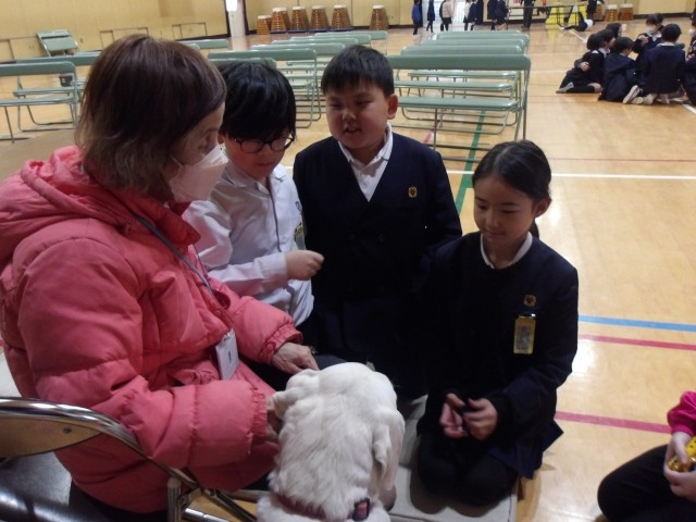 毎年、3年生で行っている「盲導犬体験」。