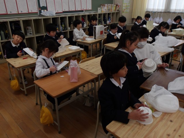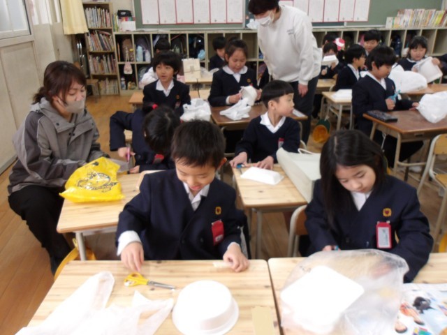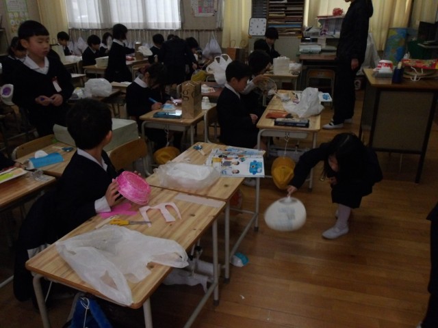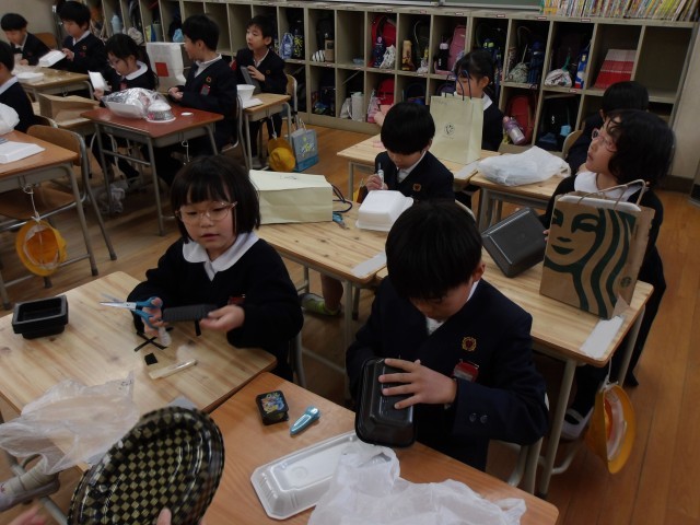 1年生は図画工作の時間に、おうちから持ってきた食品トレーやカップ麺などの空き容器を使った制作活動を行いました。