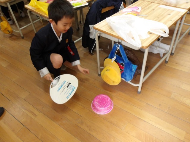 空気穴のところにうちわを使ってで風を送ると、容器がフワッと浮かび上がり前に進んでいきます。