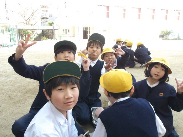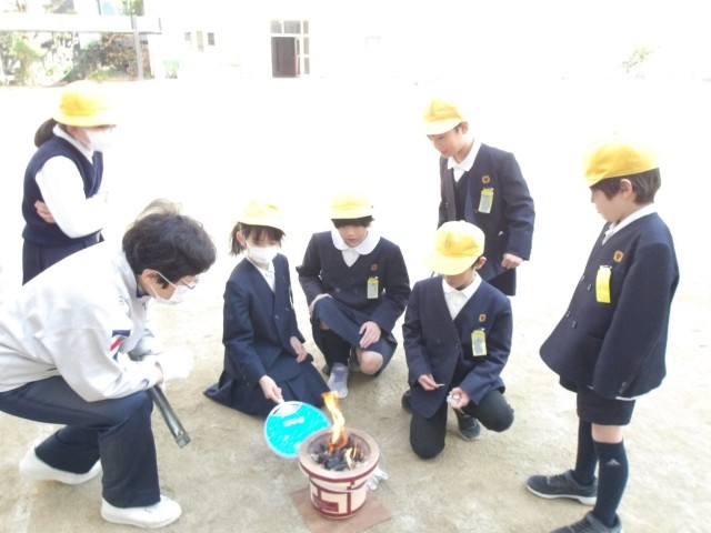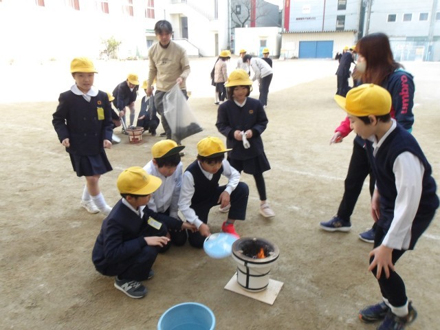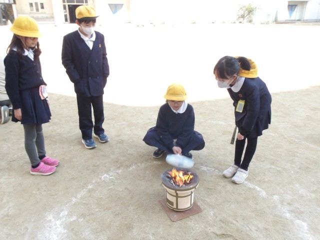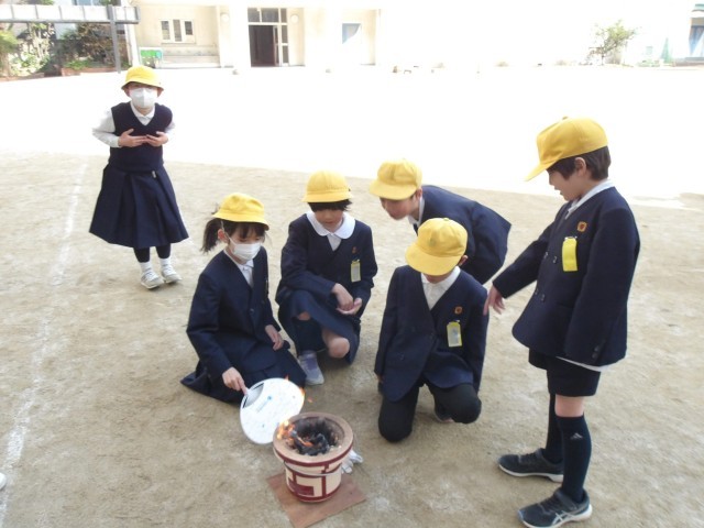 マッチの火をつけるのに時間がかかったり、火が火種に移らなかったりして少し苦労しましたが、どの班も炭に火がつき、運動場に炭火の香りが漂い、七輪で暖を取る子もいました。