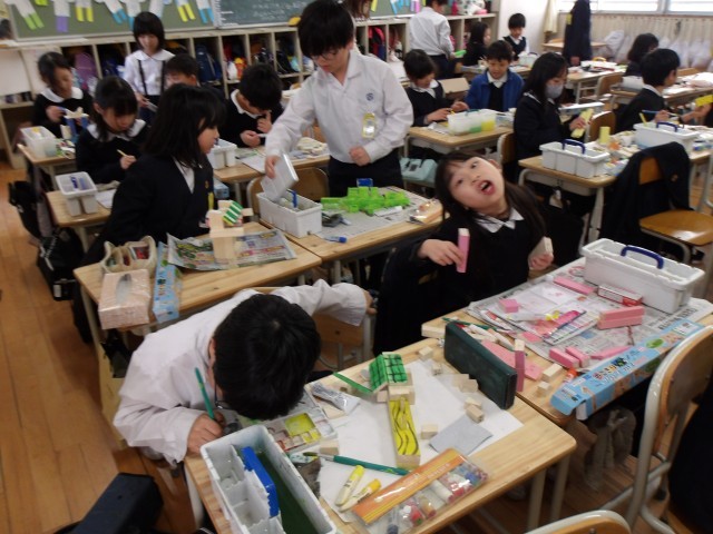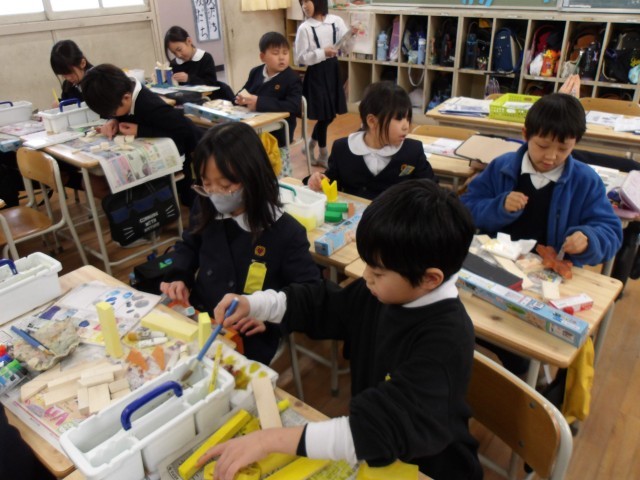 図画工作の時間にのこぎりを使って木材を切り分け、さまざまな木工作品の制作に取り組んできた3年生。