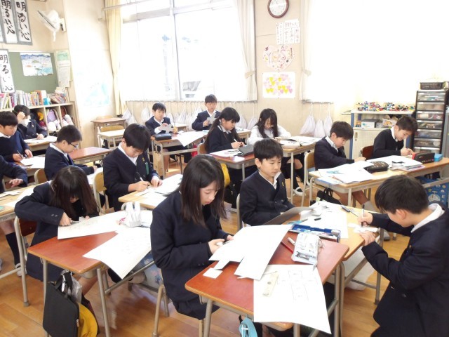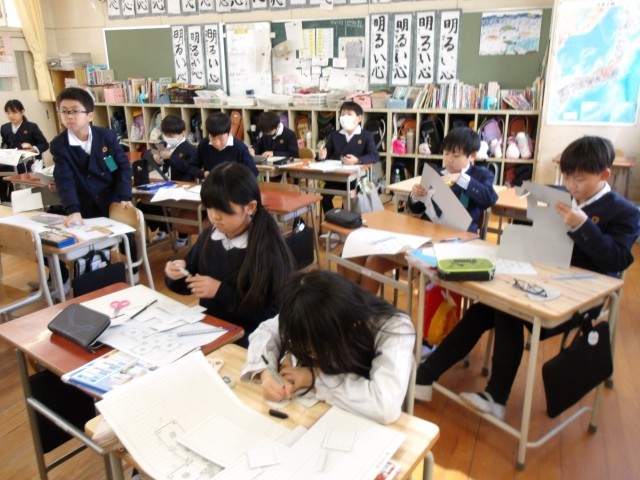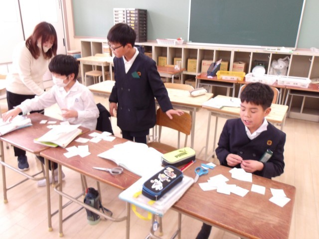 今日は立方体や直方体の展開図を使って箱の形を組み立て、面と面の関係性について考えました。