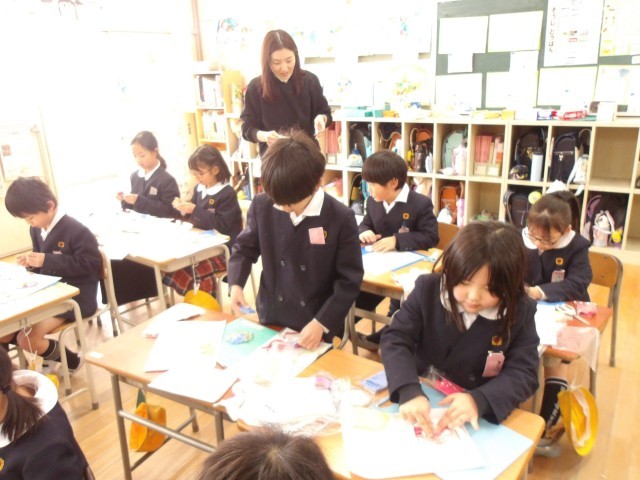 図画工作の時間に、お世話になった人に感謝の気持ちを伝える「まごころメダル」をつくっている2年生。
