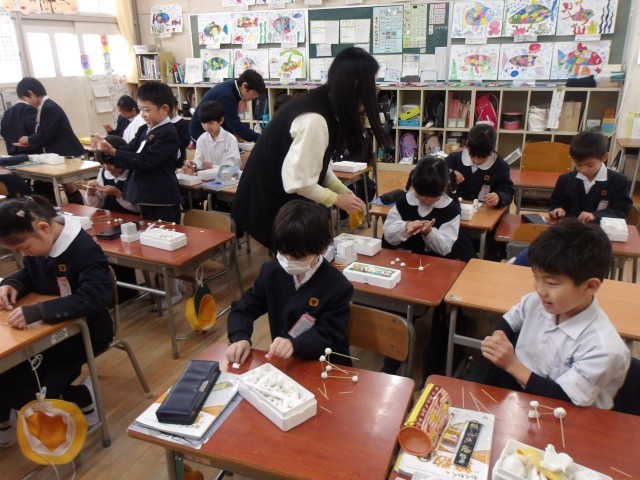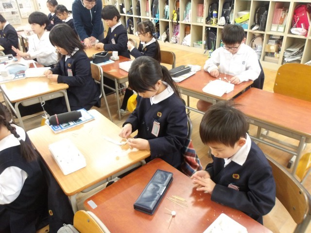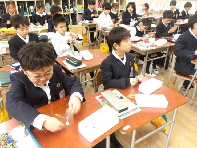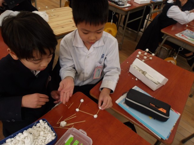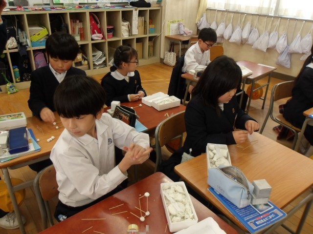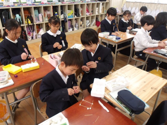 今日は竹ひごとねんど玉を使って「はこ」の形をつくる学習をしました。