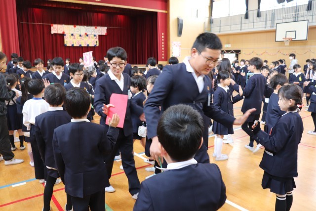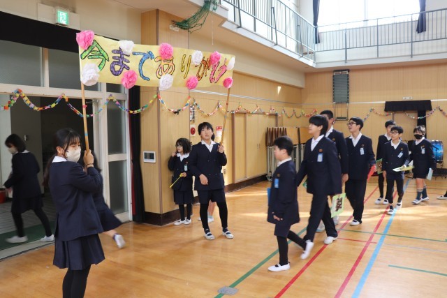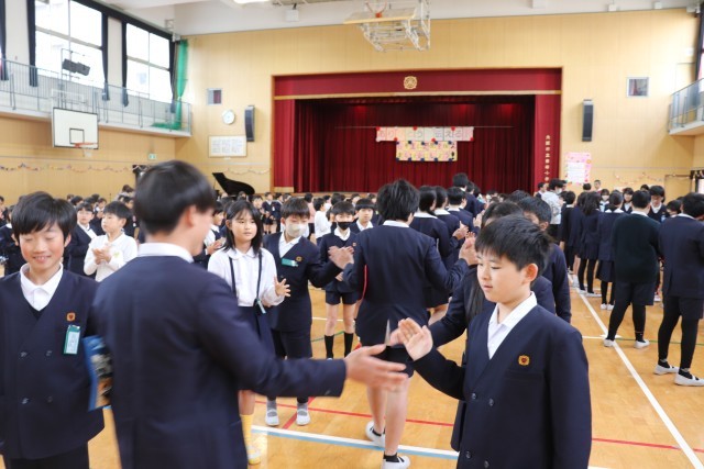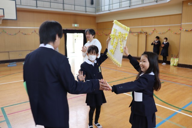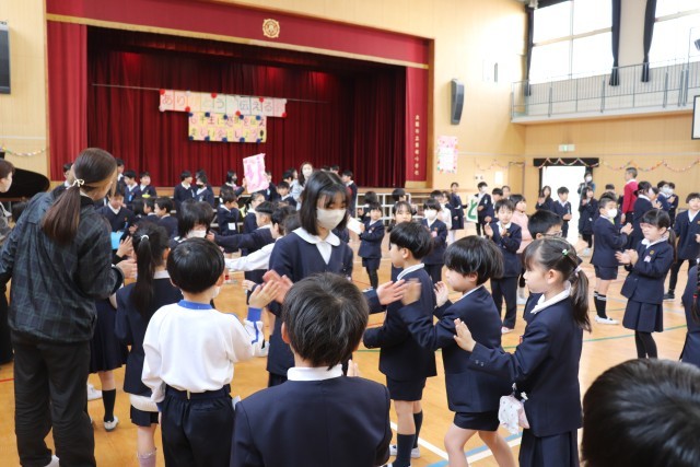 1年生から5年生までが花道を作り、ハイタッチを交わしながら6年生を見送ります。