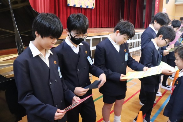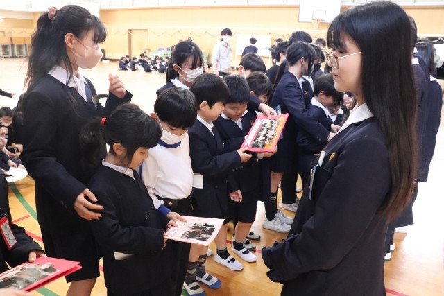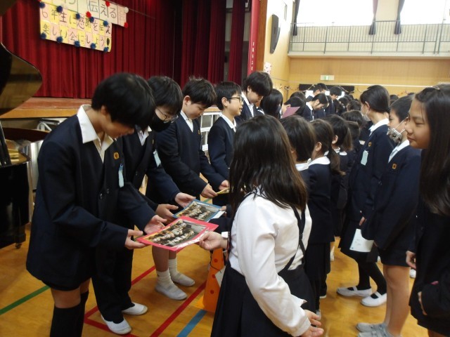 1年生から5年生までの子どもたちが感謝の気持ちを込めて書いたメッセージカードを6年生に手渡します。