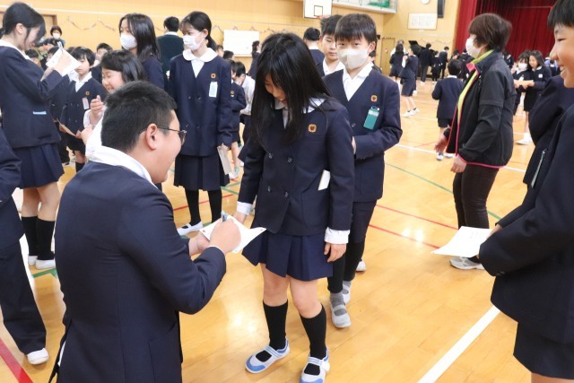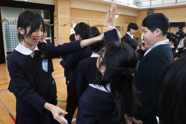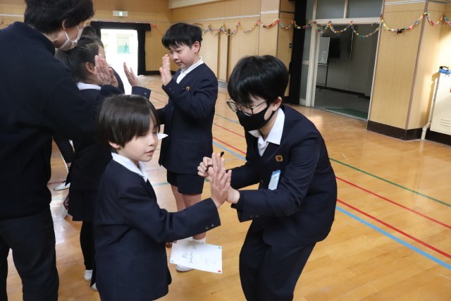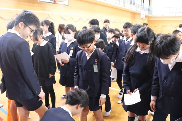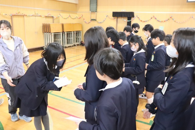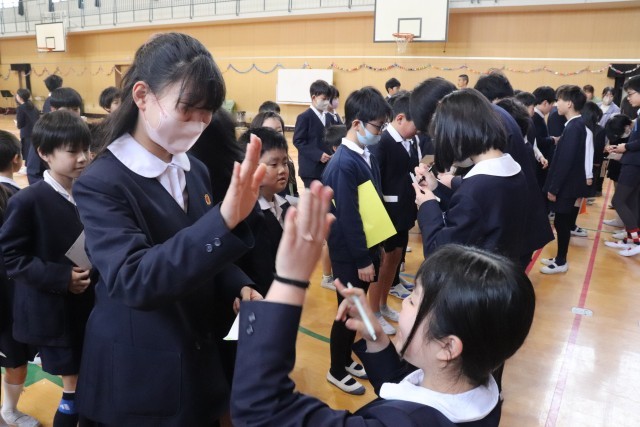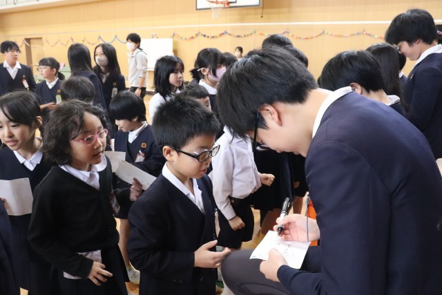 「ありがとうを伝える会」で、子どもたちがもっとも楽しみにしている時間、1年生から5年生の子どもたちが6年生に記念の“サイン”をもらいにいきます。
