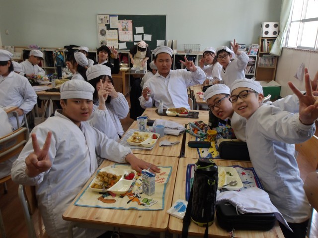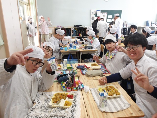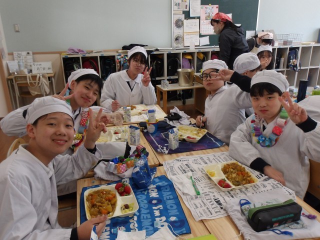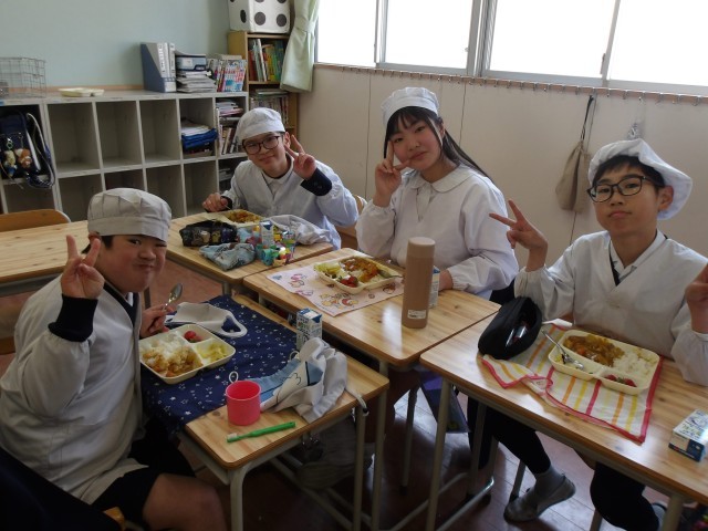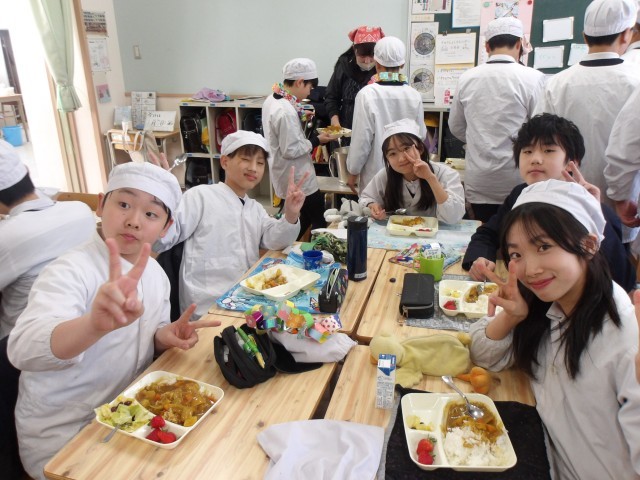 チキンカレーライスには、給食調理員さんが“ラッキーにんじん”“ラッキーじゃがいも”を入れてくださっています!