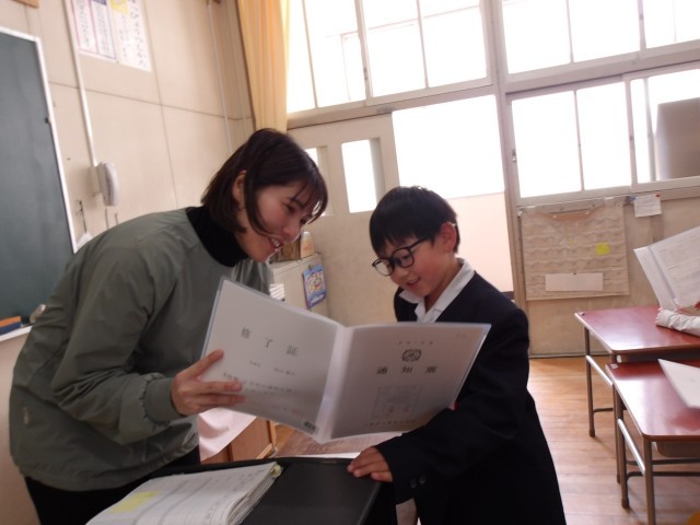 1年間の頑張りを記した通知票を担任の先生から受け取ります。