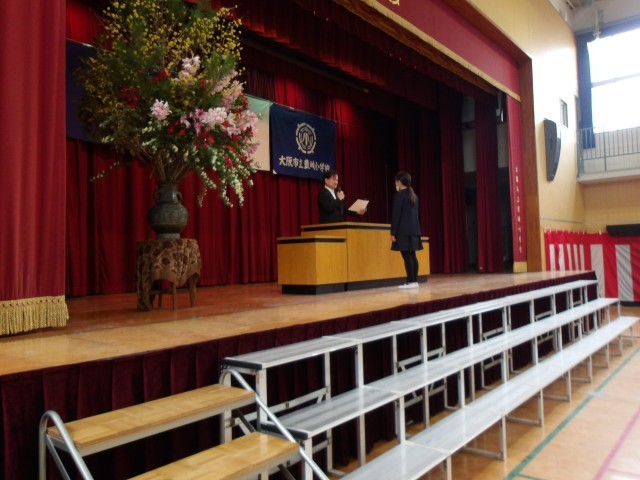 講堂で1年生から5年生全員が集まり、各学年の代表の子どもたちが校長先生から「修了証」を受け取りました。