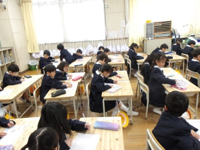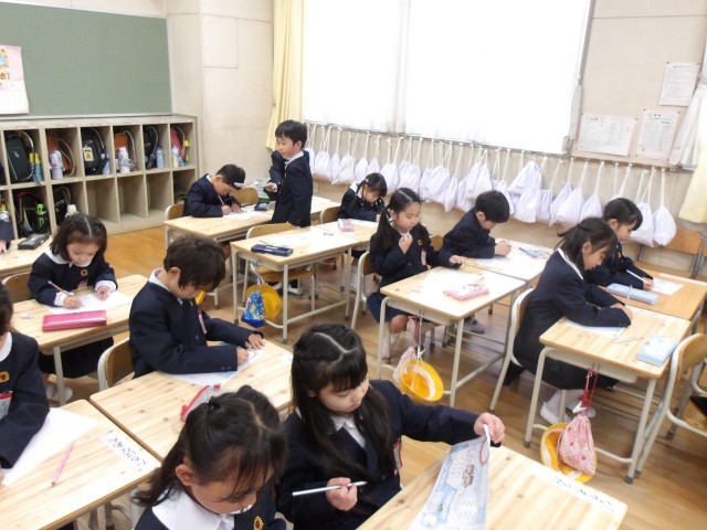 前から後ろのおともだちにプリントをわたす。プリントをファイルにとじる。など、おぼえることがたくさんあります。先生のお話をしっかりと聞いて、一つ一つ覚えています。1年生、頑張っています。