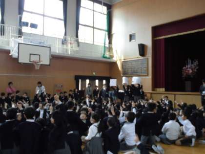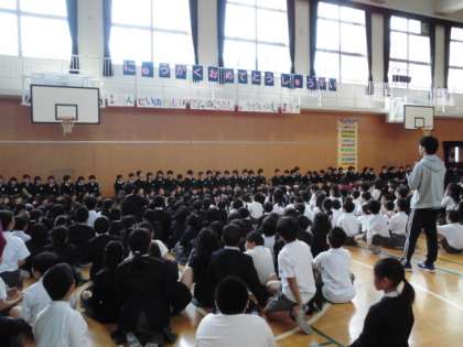 4月12日(金)、入学おめでとう集会がありました。初めは緊張した様子の1年生でしたが、クイズやゲームが始まると大盛り上がりでみんなとても楽しそうでした。「1年生の思い出に残る集会にしよう!」のめあてを達成できたようで、2〜6年生のみんなも満足そうな笑顔を見せていました。