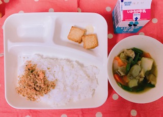 今日のこんだて【米飯、鶏肉とじゃがいもの煮もの、あつあげのしょうゆだれかけ、紅ざけそぼろ、牛乳】