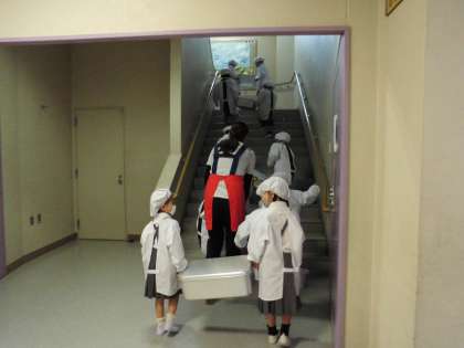 初めは、6年生のお兄さんとお姉さんに運んでもらっていた給食も自分たちで頑張って運んでいます。
