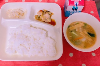 今日のこんだて【米飯、焼きとり、みそ汁、もやしのゆずの香あえ、牛乳】