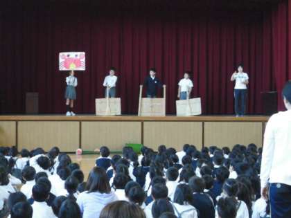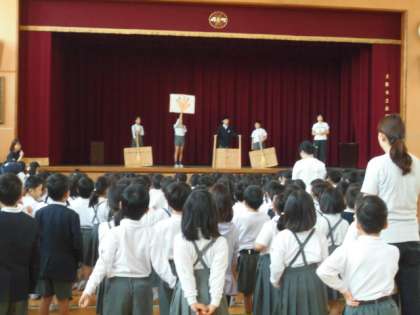 今年度初めての児童集会をしました。ともだちグループでの並び方や、集会委員会の人が出す絵カードで「グー:座る」「チョキ:並ぶ」「パー:立つ」「カニ:静かに」というルールを覚えました。長い連休明けの今日でしたが、みんな生き生きと活動していました。