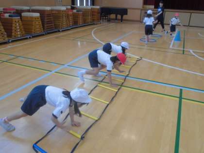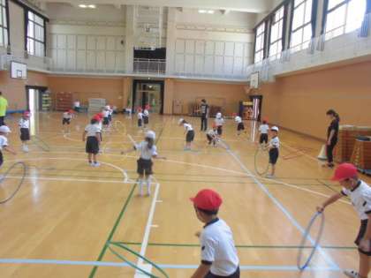 フラフープやラダーを使って、手と足を連動させる練習をしました。