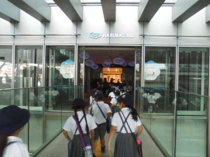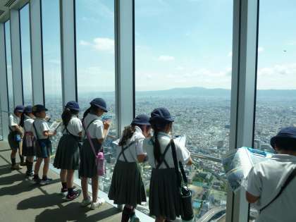 社会見学で阿倍野ハルカスへ行ってきました。みんな、展望台まで上がるエレベーターの速さにビックリしていました。展望台についてからは、「うわ〜、高い!」「遠くまで見えるね。」や「小学校は見えるかな?」と探している様子も見られました。方角によって大阪市の町並みは違うことに気づき、今後の学習に生かしていく見学になりました。