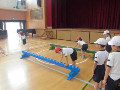 平均台は渡るだけでなく、跳び箱のように跳び越えました