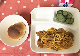 今日のこんだて【1/2黒糖パン スパゲッティミートソース きゅうりのバジル風味サラダ 牛乳】