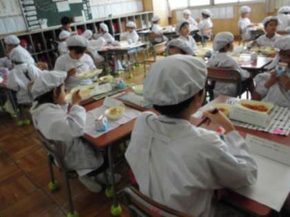 それぞれのクラスに、1年生と6年生、先生たちが集まって一緒に食べました。クイズを出したり楽しく交流できました。