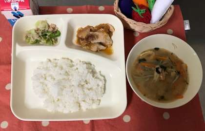 今日のこんだて【米飯、鶏肉のおろしじょうゆかけ、みそ汁、野菜いため、牛乳】