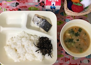 今日のこんだて【米飯、さごしの塩焼き、みそ汁、牛ひじきそぼろ、牛乳】