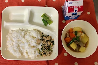 今日のこんだて【米飯、豚肉とじゃがいもの煮もの、オクラの甘酢あえ、ツナっ葉いため、牛乳】