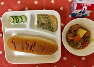 今日のこんだて【米飯、もずく入りヒラヤーチー、豚肉といかの煮もの、あっさりきゅうり、牛乳】