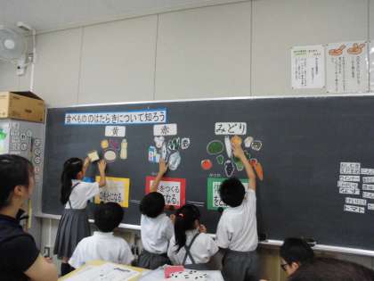 栄養教諭の先生に来ていただき、食べ物の働きについて教えていただきました。