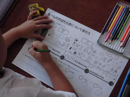 ワークシートには、色をぬったり、言葉でまとめたりすることで、日ごろから食べているものについて、より詳しくなることができました。