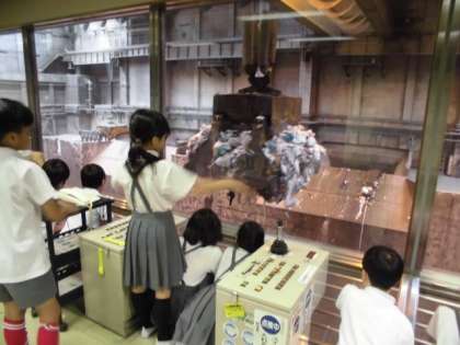 始めはDVDを見てごみの処理の仕方や施設の設備について学び、その後は3グループに分かれて、実際に施設内を見学させて頂きました。子どもたちは、ごみを撹拌するクレーンの大きさに驚いたり、つい先日見せてもらったパッカー車の登場に喜んだりしていました。