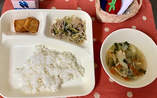 今日のこんだて【米飯、ゴーヤチャンプルー、すまし汁、あつあげのしょうがじょうゆかけ、牛乳】