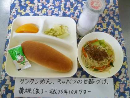 昨日は暴風警報発令により臨時休業で残念でした。今日はラーメンにひき肉で作った肉みそをのせて食べる「タンタンめん」です。チンゲン菜やニンジンの色合いも美しく、とてもおいしくいただきました。コッペパンは、朝焼きでふっくらしておいしかったです。