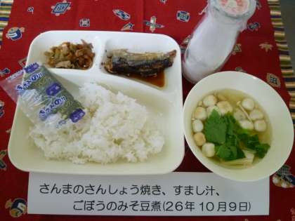 旬のさんまを焼き物機で焼いて、さんしょう風味のたれをかけたメインのおかずは、学校で炊いた炊き立てごはんによく合いました。ごぼう、大豆をみそ味で炒めた「ごぼうのみそ豆煮」は、食物繊維や鉄分がたっぷりで、よくかめるおかずでした。だしをていねいにとって作ったすまし汁は、香りよく絶品でした。