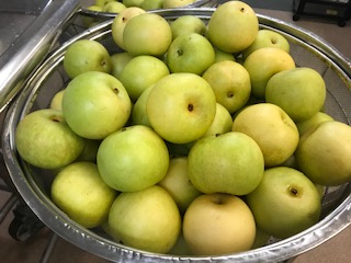 今日の給食室には、たくさんのなしが届けられ、ひとつずつ調理員さんが切りわけてくださいました。