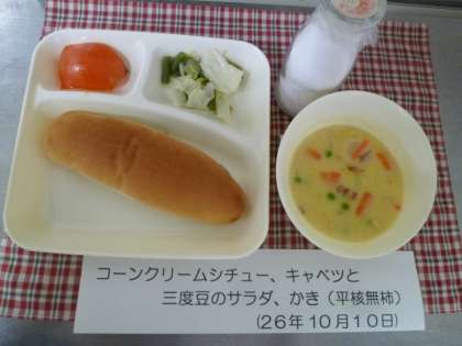 クリームシチューは、小麦粉とサラダ油をていねいに炒めてホワイトルウを手作りしてとろみをつけています。レーズンパンは、朝焼きでやわらかく、ふわふわでおいしかったです。今日は6年生が修学旅行で食数が少ないので、調理員さんが特別に柿の皮をむいてくださいました。ふだんは、果物の皮にたっぷり含まれるポリフェノールや繊維分をとるために、皮つきのりんごやなしを出しています。