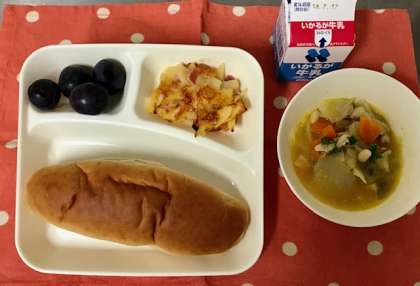 今日のこんだて【黒糖パン、鶏肉とてぼ豆のスープ煮、じゃがいもとトマトのチーズ焼き、ぶどう(巨峰)、牛乳】