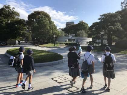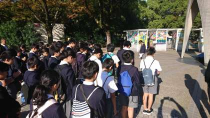 さっそく、原爆の子の像の前で平和集会を行い、74年前(昭和20年)の8月6日、原爆が投下された午前8時15分に合わせて黙とうをしました。